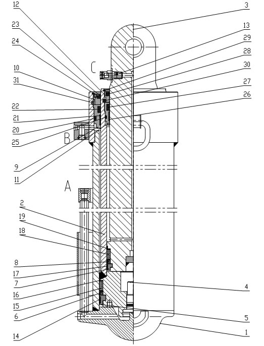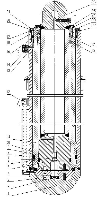 1.外缸體 2.擋圈 3.壓緊螺母 4.底閥 5.O形圈 6.螺紋堵 7.活塞密封 8.活塞密封 9.外導(dǎo)向環(huán) 10.外導(dǎo)向環(huán) 11.中缸體 12.密封墊 13.導(dǎo)向套 14.內(nèi)導(dǎo)向環(huán) 15.導(dǎo)向套 16.桿密封 17.內(nèi)導(dǎo)向環(huán) 18.靜密封 19.O形圈 20.螺釘 21.防塵圈 22.桿密封 23.靜密封 24.O形圈 25.防塵圈 26.活柱
